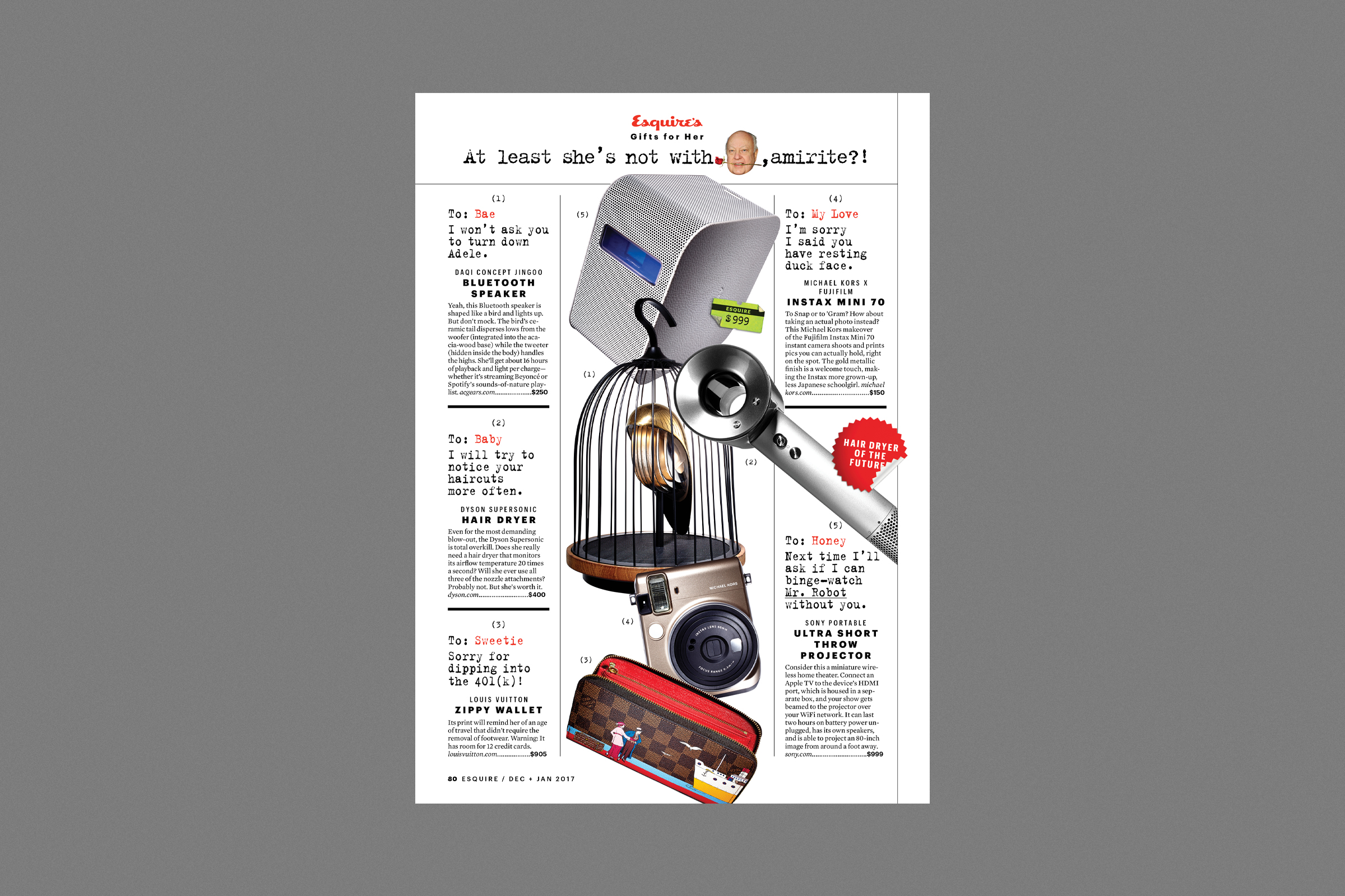 The 2017 Esquire annual gift guide was inspired by an Esquire cover from the 50’s that utilizes pictures to replace words in a letter. The gifts are divided by who the gift is for and is offered up with a satirical tone.